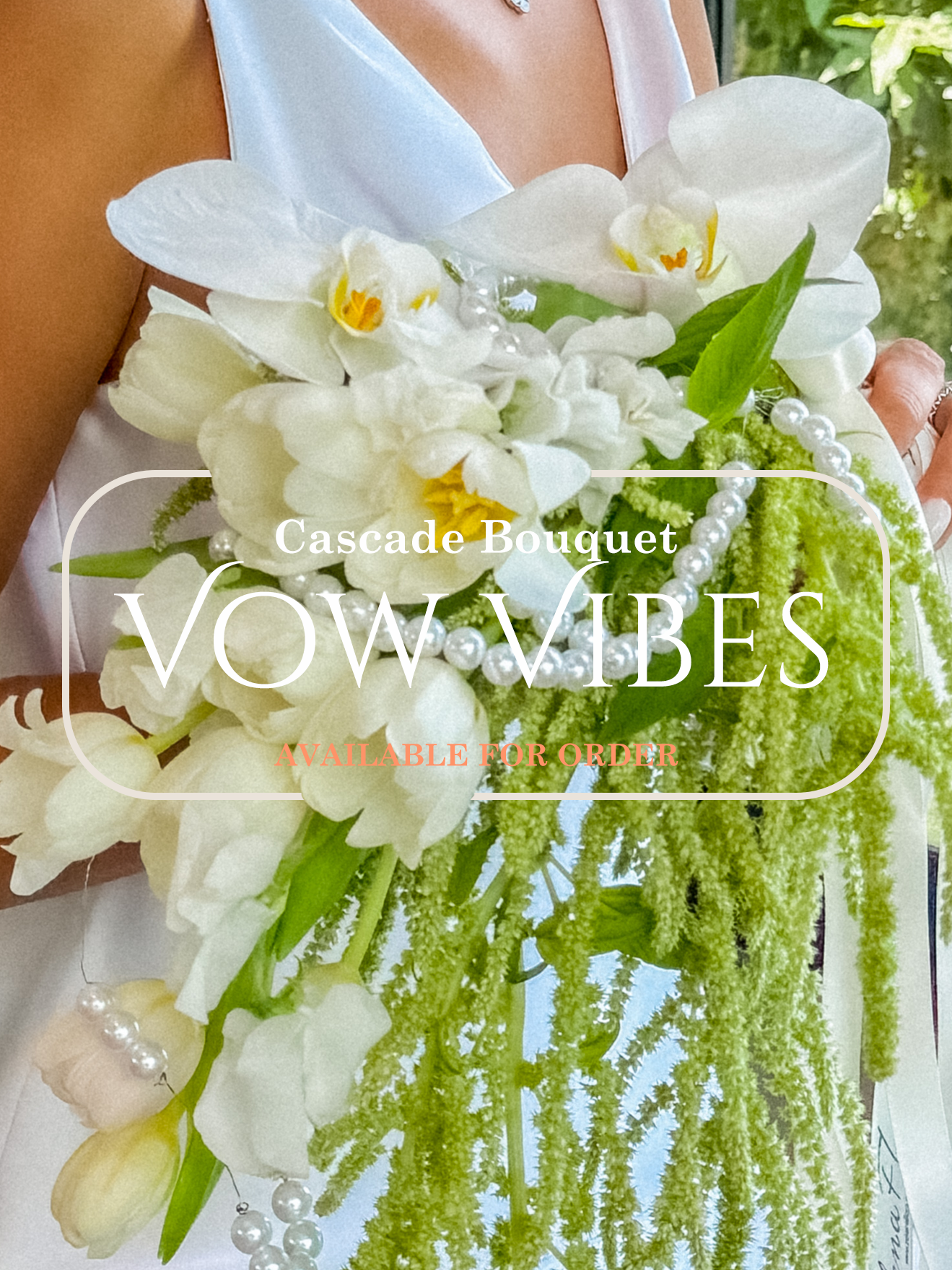 Say hello to Vow Vibes — the kinda bouquet that doesn’t just walk down the aisle… it floats. This cascading stunner is for the bride who’s got chill confidence, soft glam, and all the right kind of drama. It’s romantic, modern, and gives main character energy without trying too hard. Whether you’re eloping on the cliffs or vibing in a rooftop ceremony in DTLA, Vow Vibes brings grace and glow.