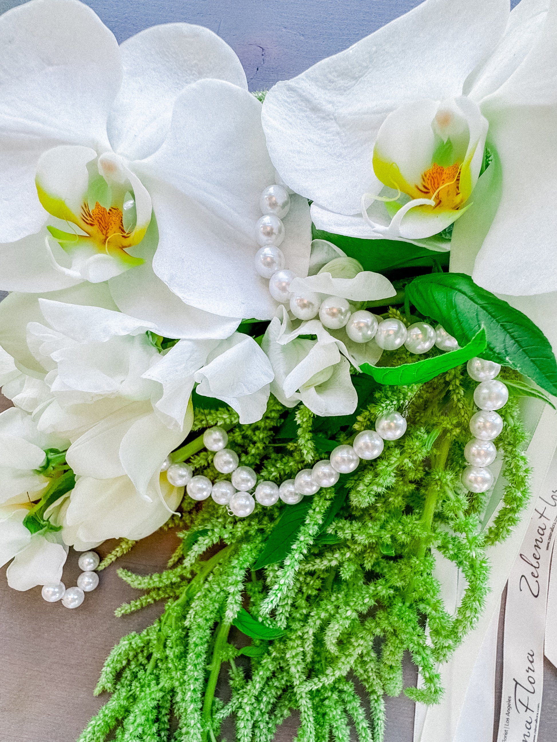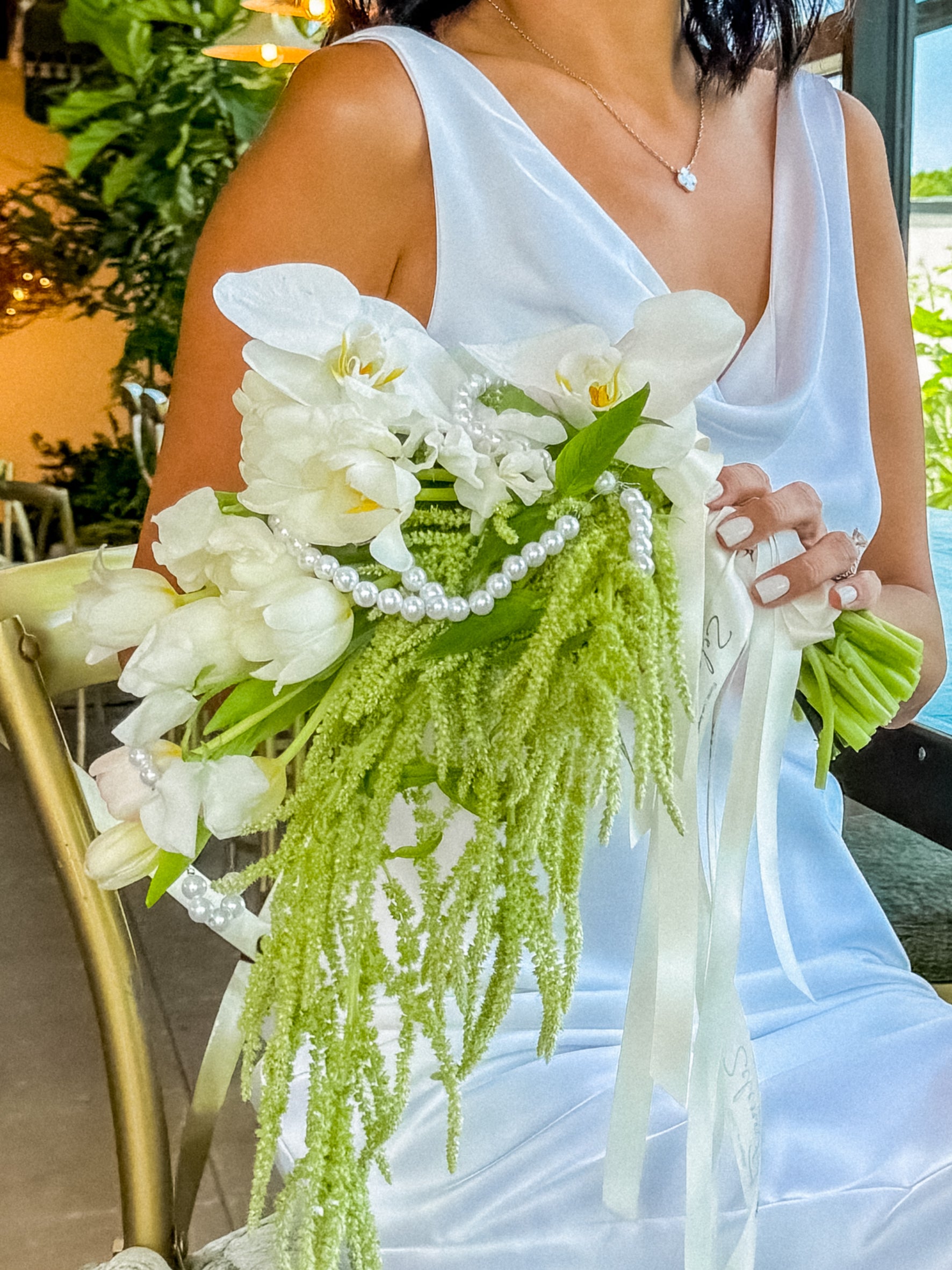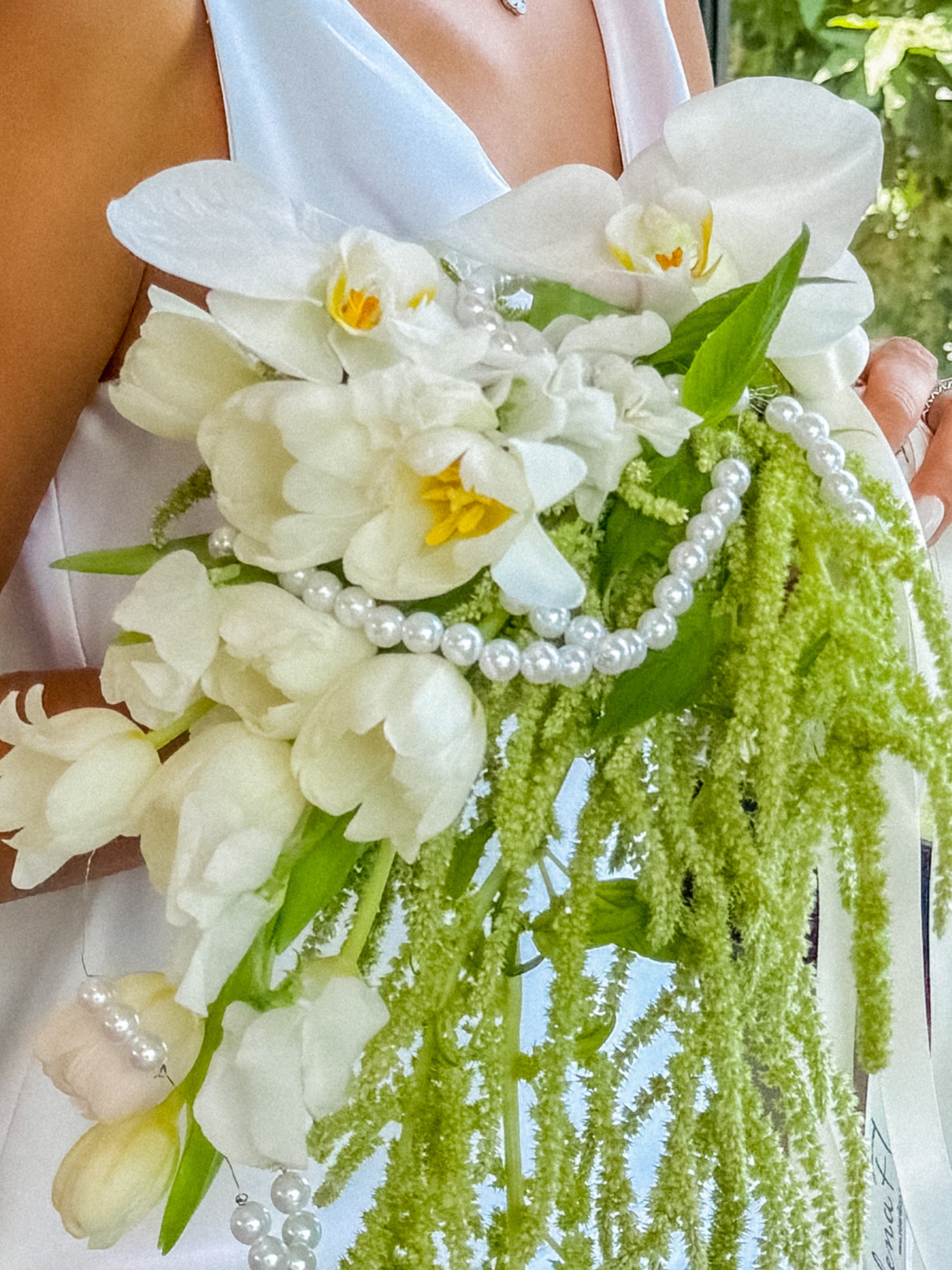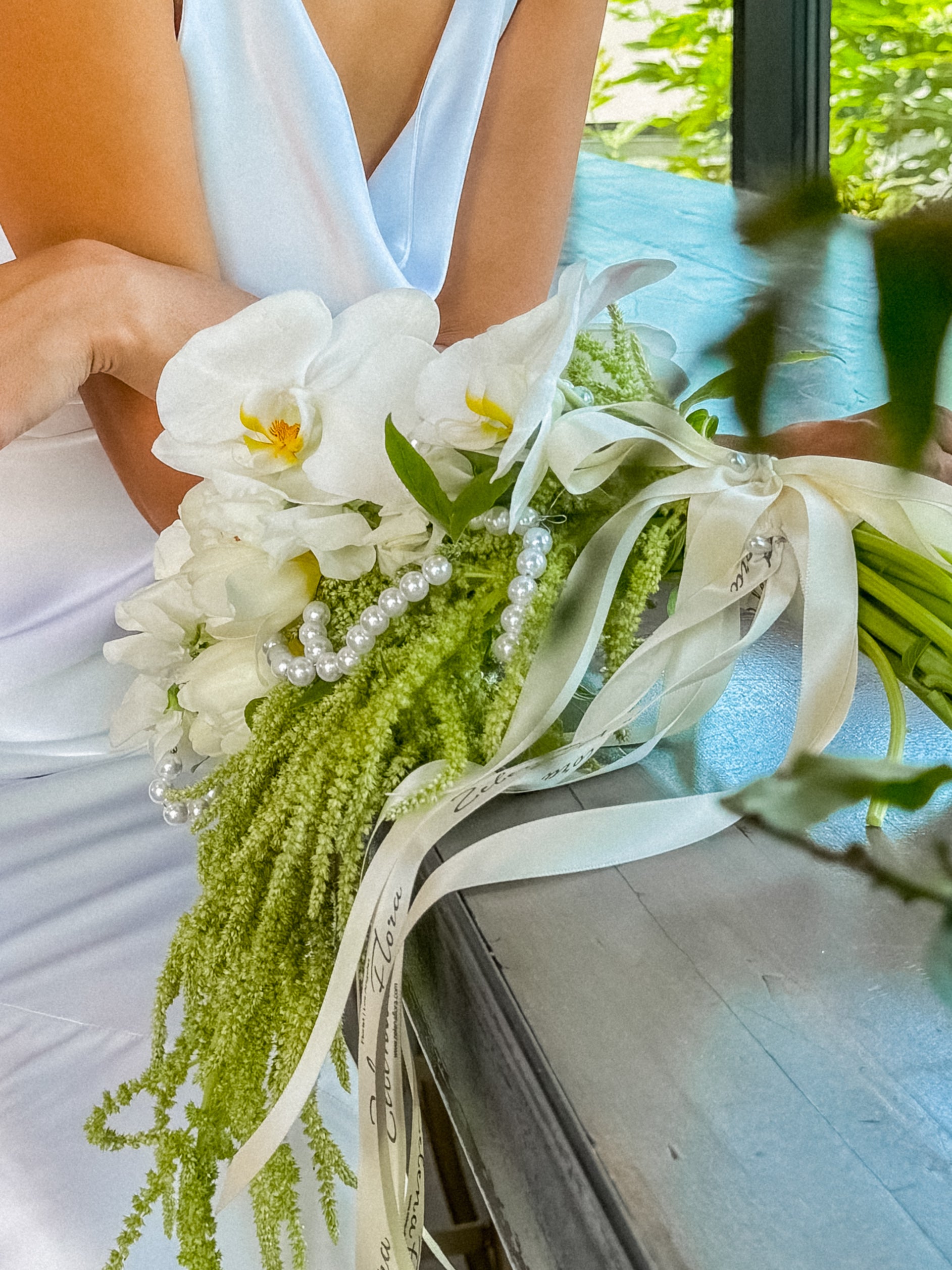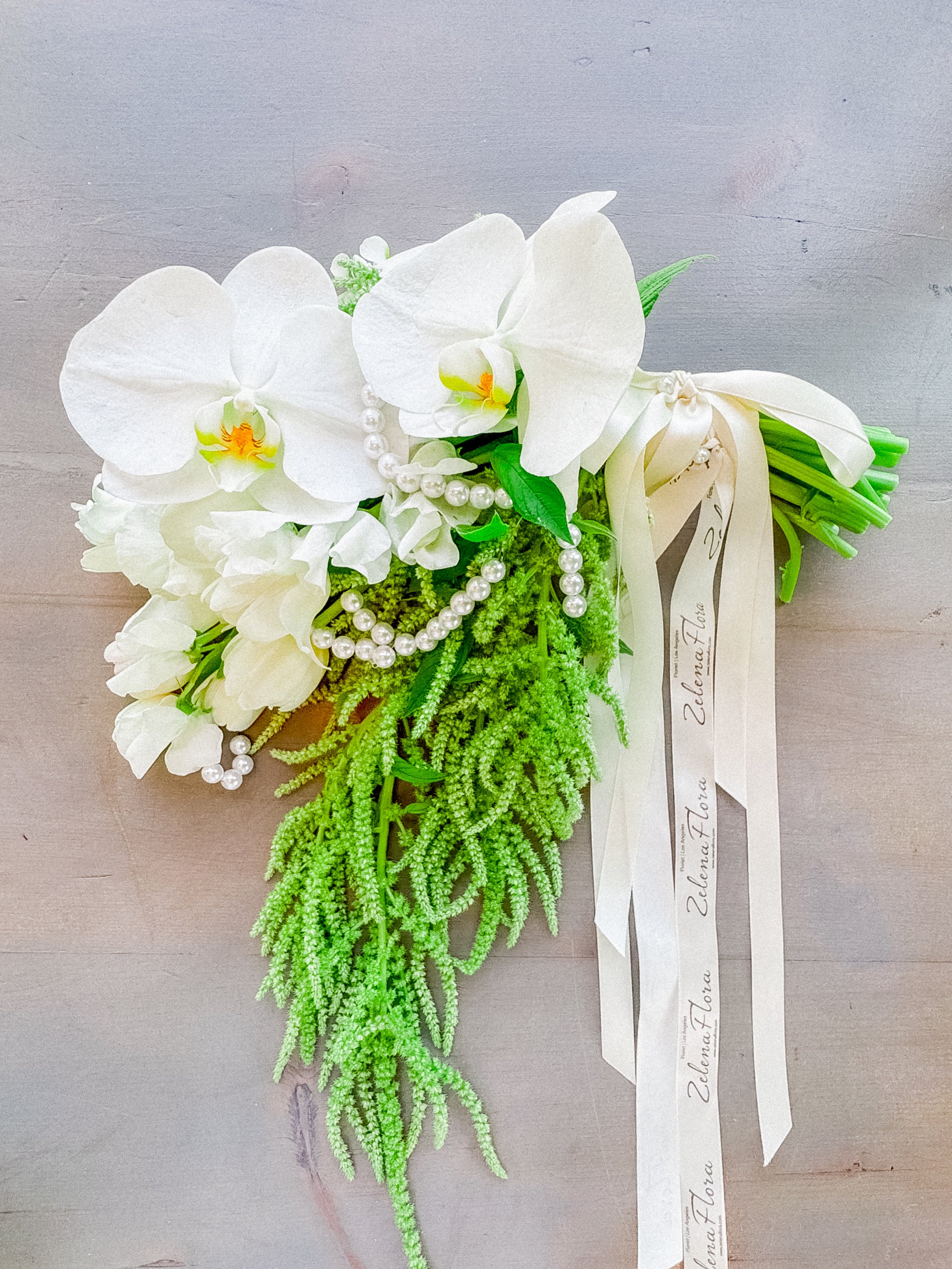 White phalaenopsis orchids, Creamy lisianthus, Green hanging amaranthus, White Tulip, Touches of greenery (possibly ruscus or similar)