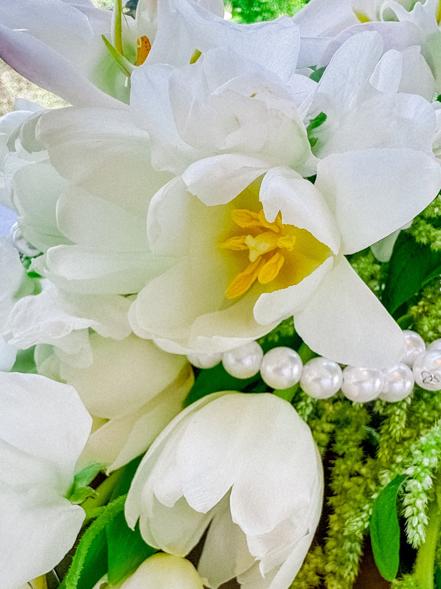 Satin ribbons (ivory or champagne), Faux pearls, Florist tape, Soft binding wire (interior)