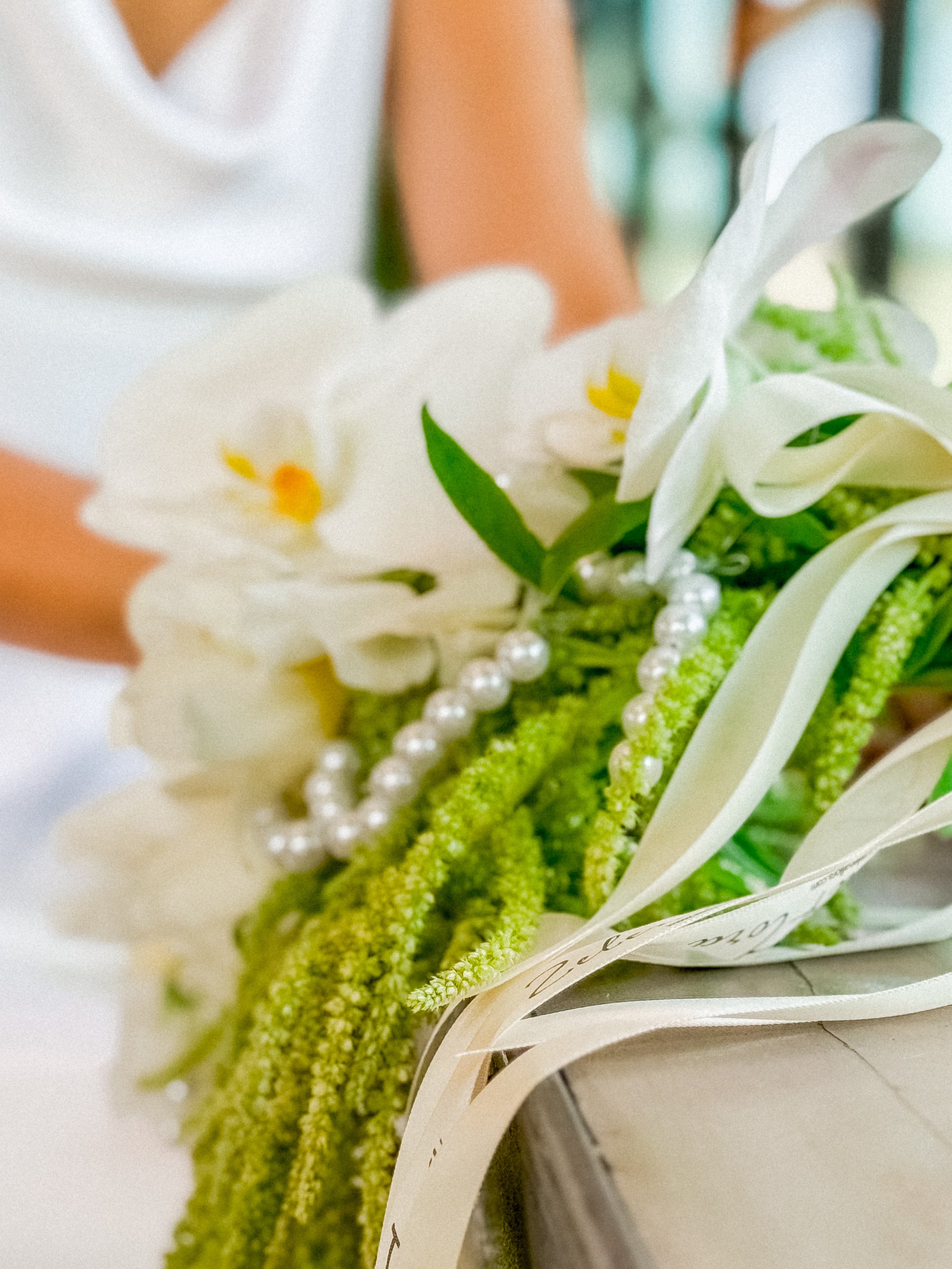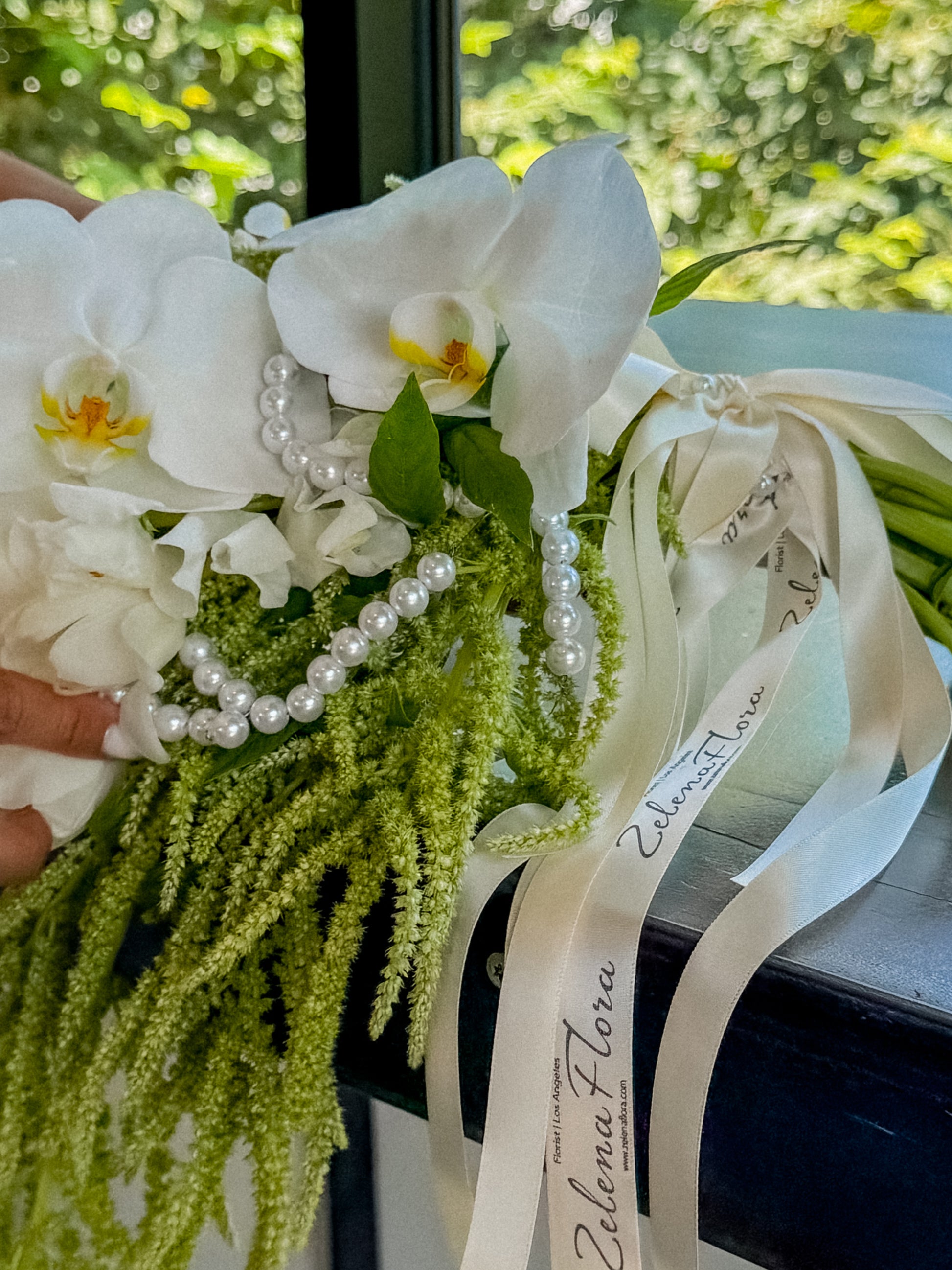 Long cascading ivory satin ribbons with printed branding, Pearl strands (faux pearl garland), Textured stems in a natural hand-tied waterfall/cascade layout