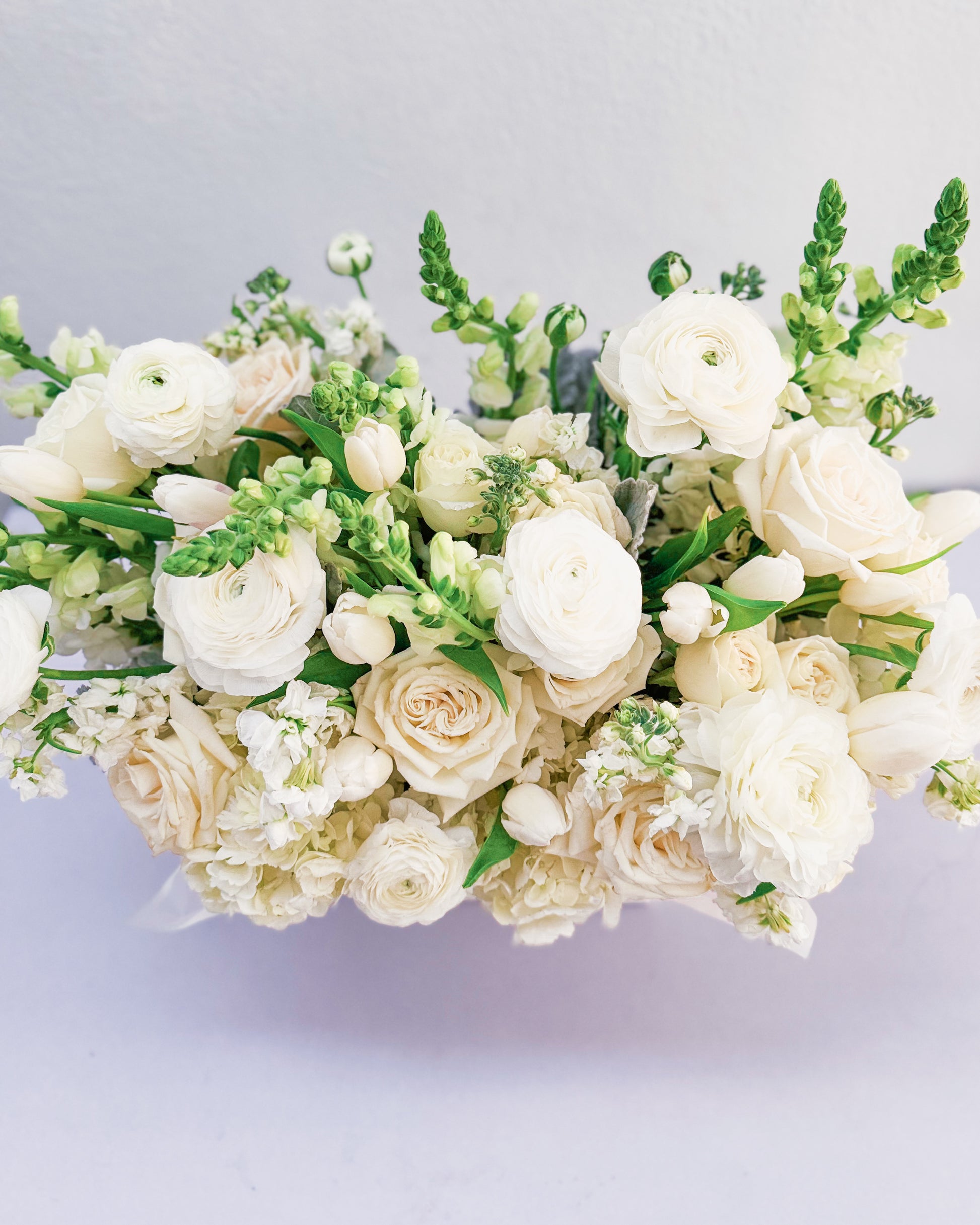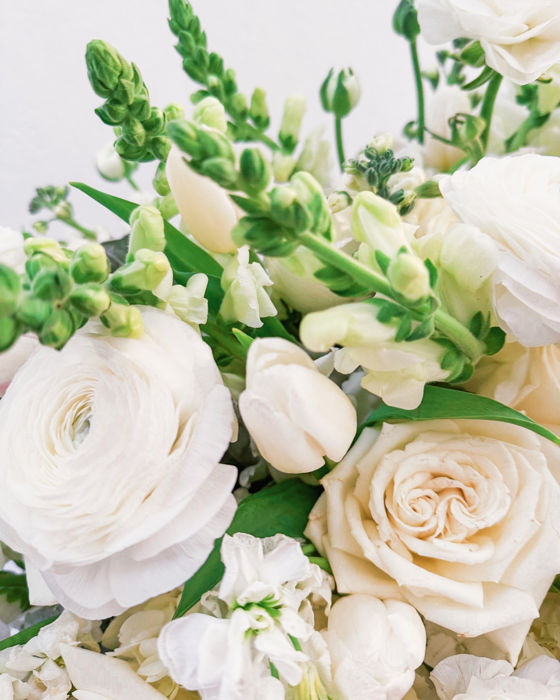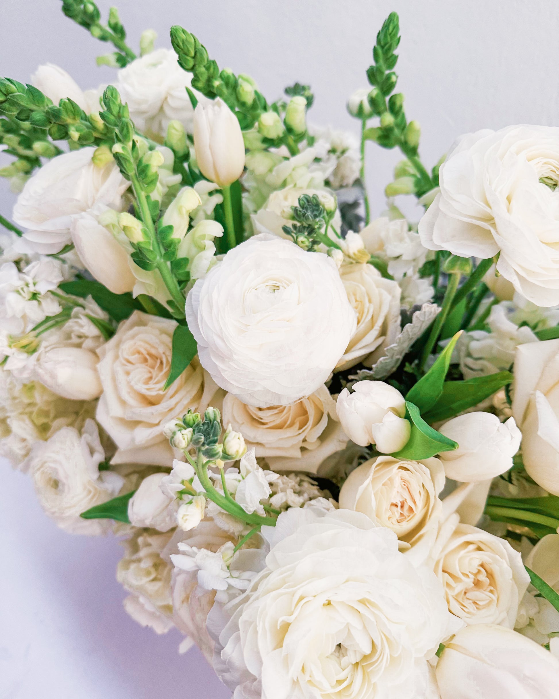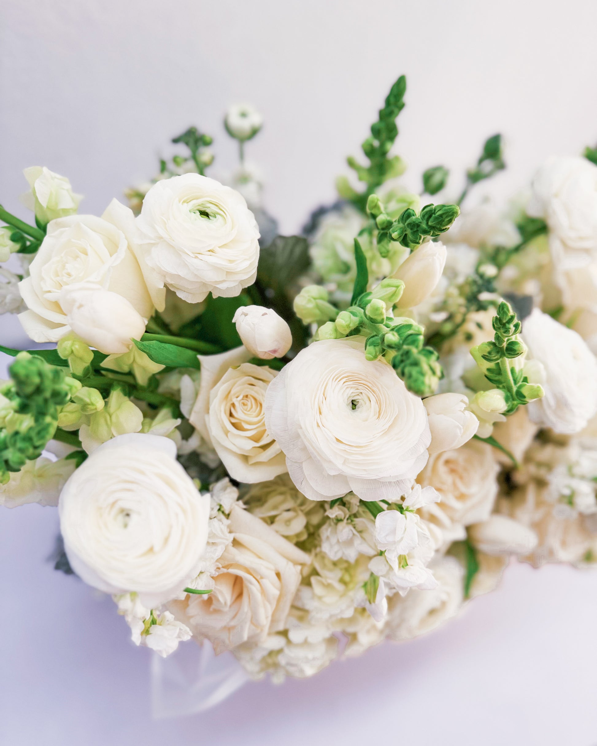 Flowers: White roses, ranunculus, hydrangeas, tulips, snapdragons, stock flowers