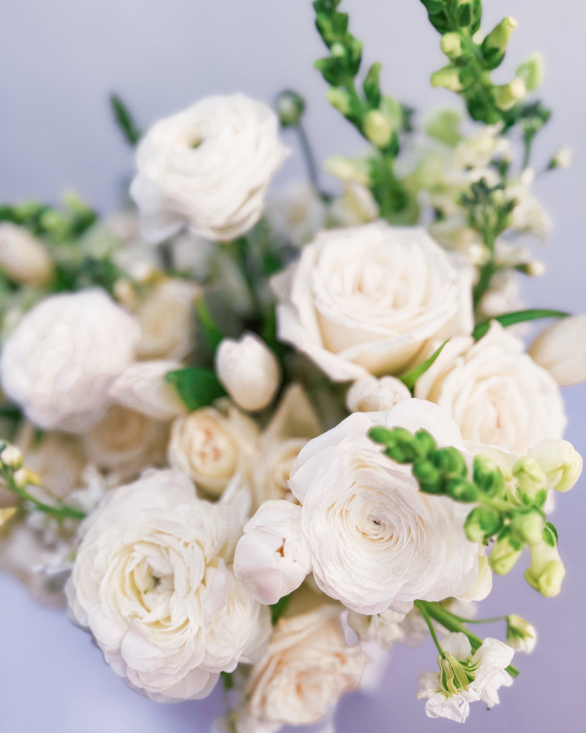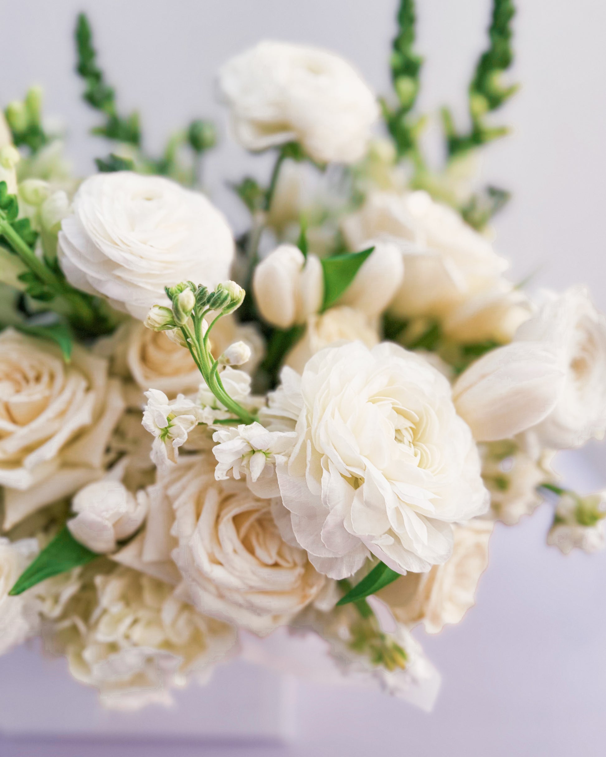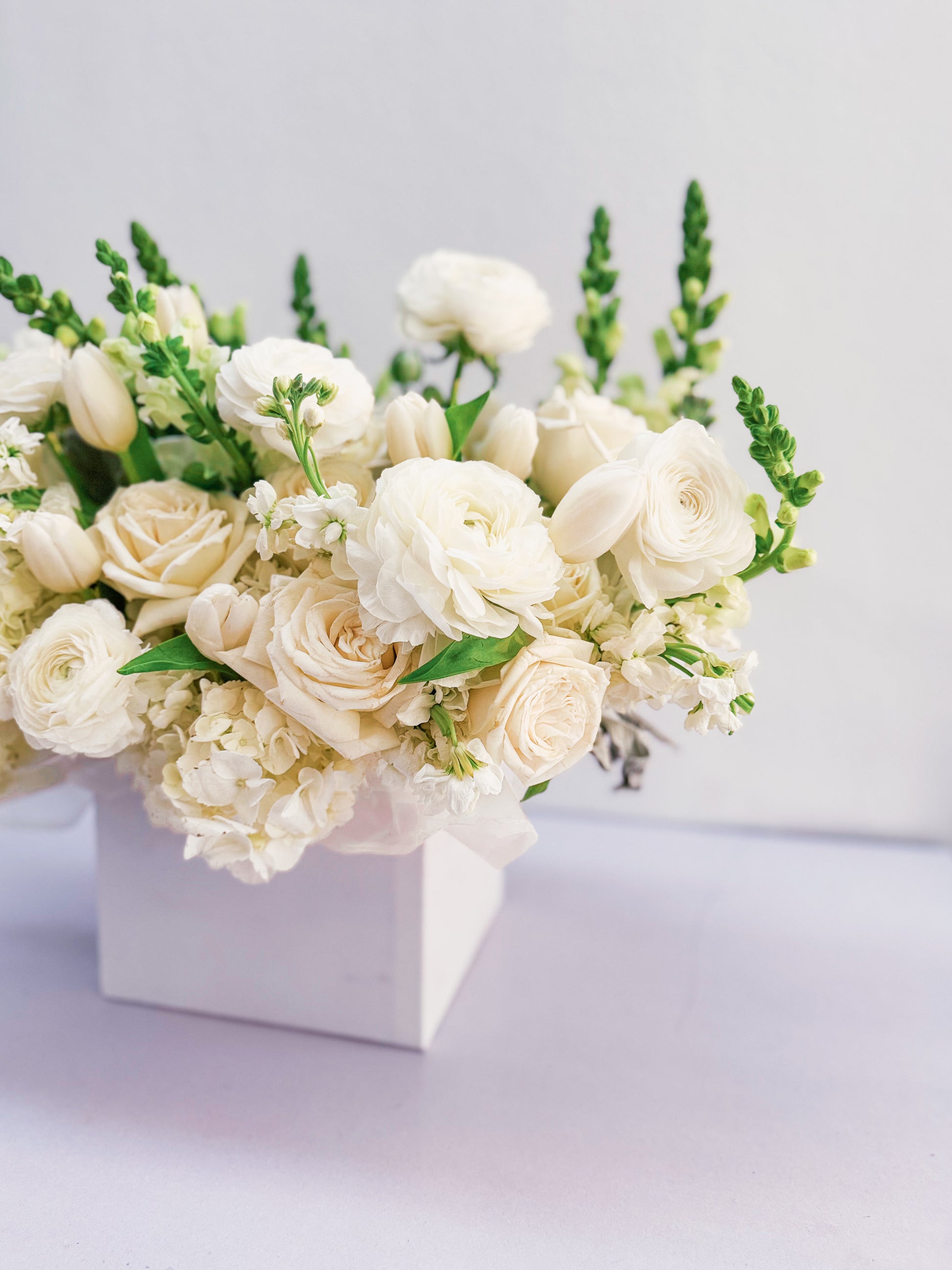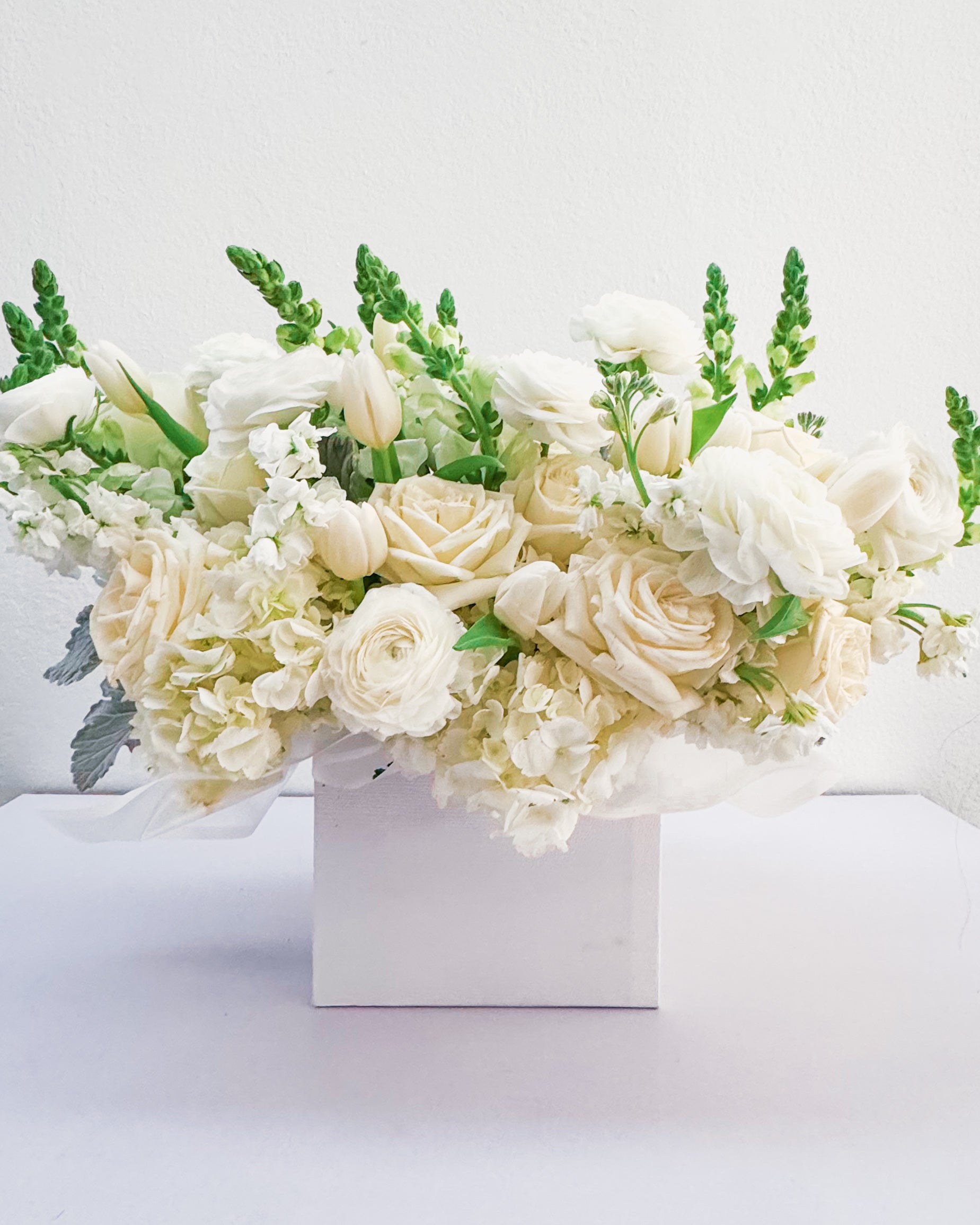 Flowers: White roses, ranunculus, hydrangeas, tulips, snapdragons, stock flowers