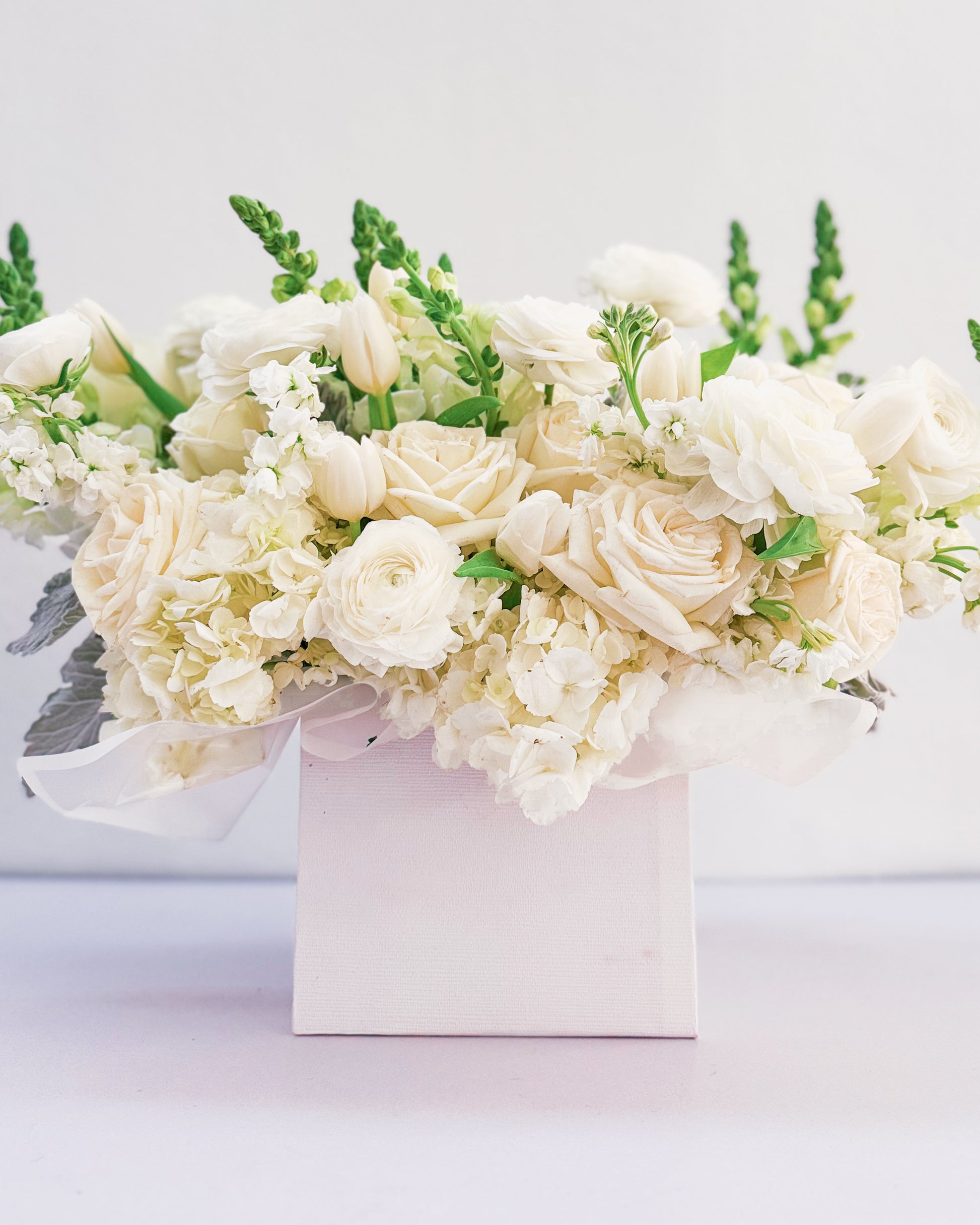 Foliage: Snapdragons, Roses, Tulips, Ranunculus, Hydrangeas, Stock, Dusty miller,