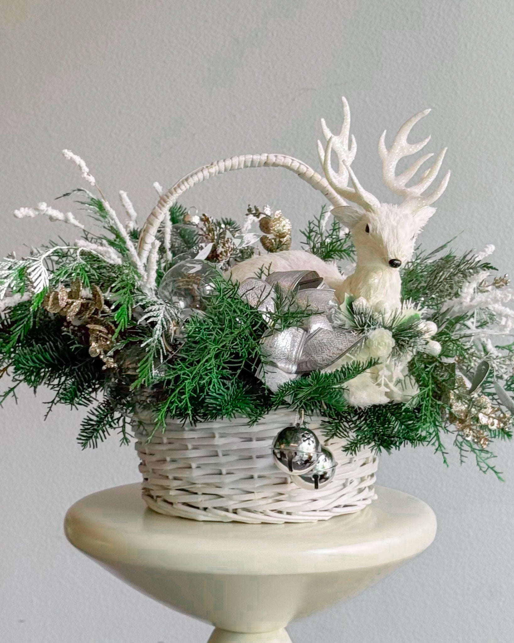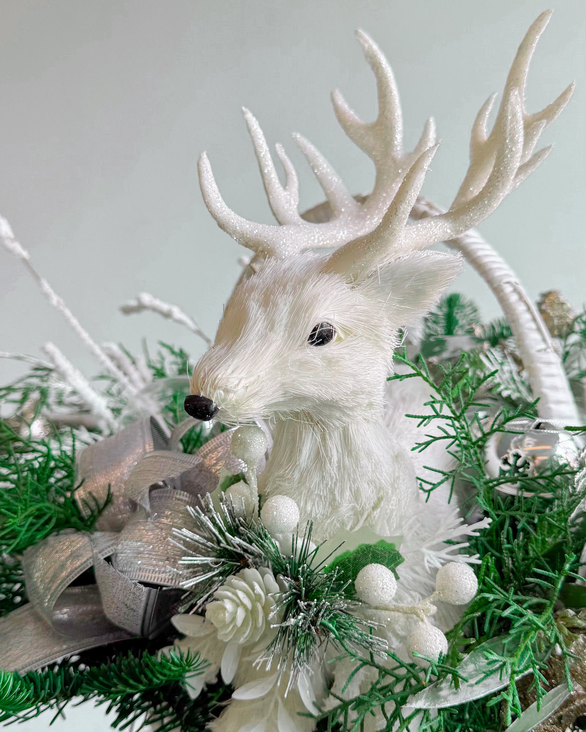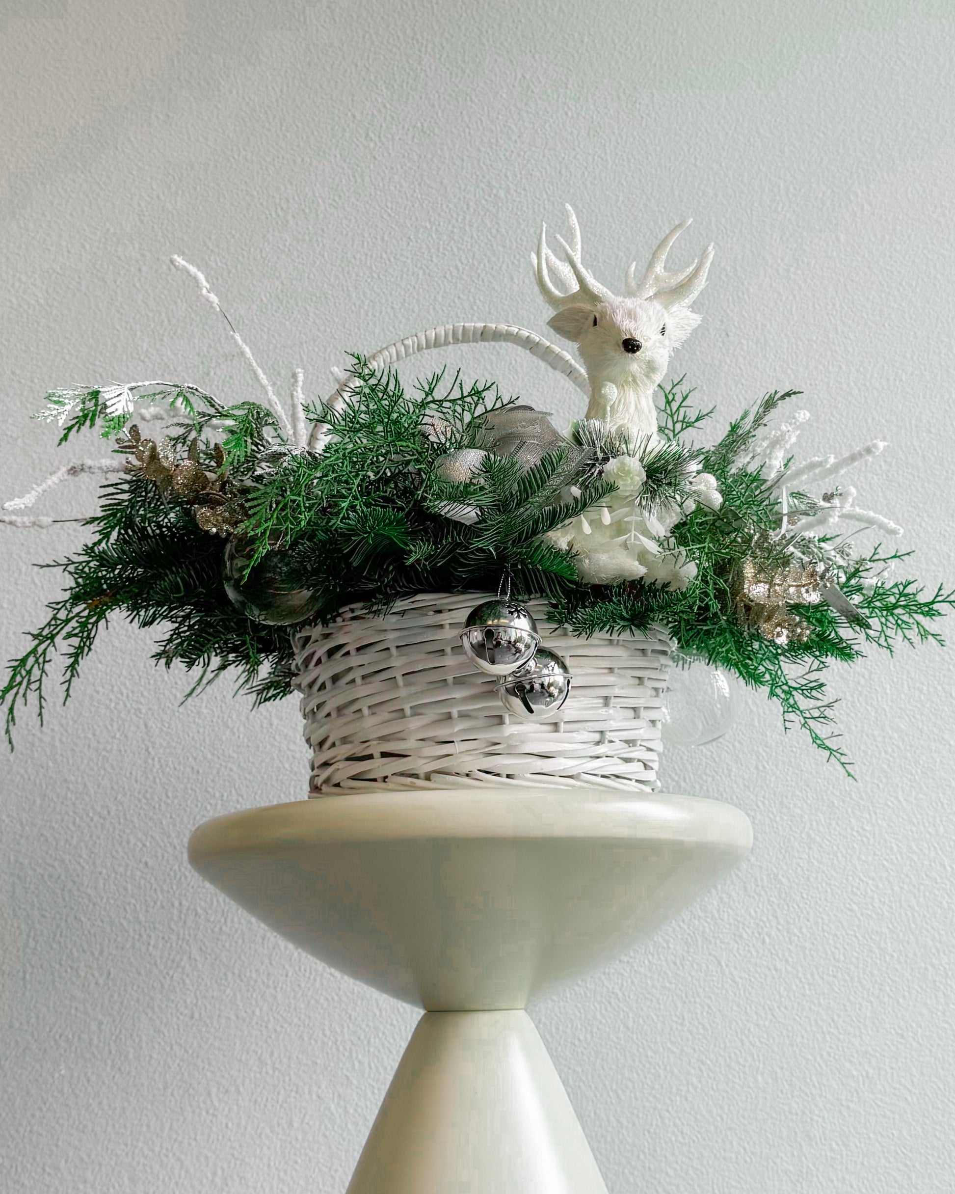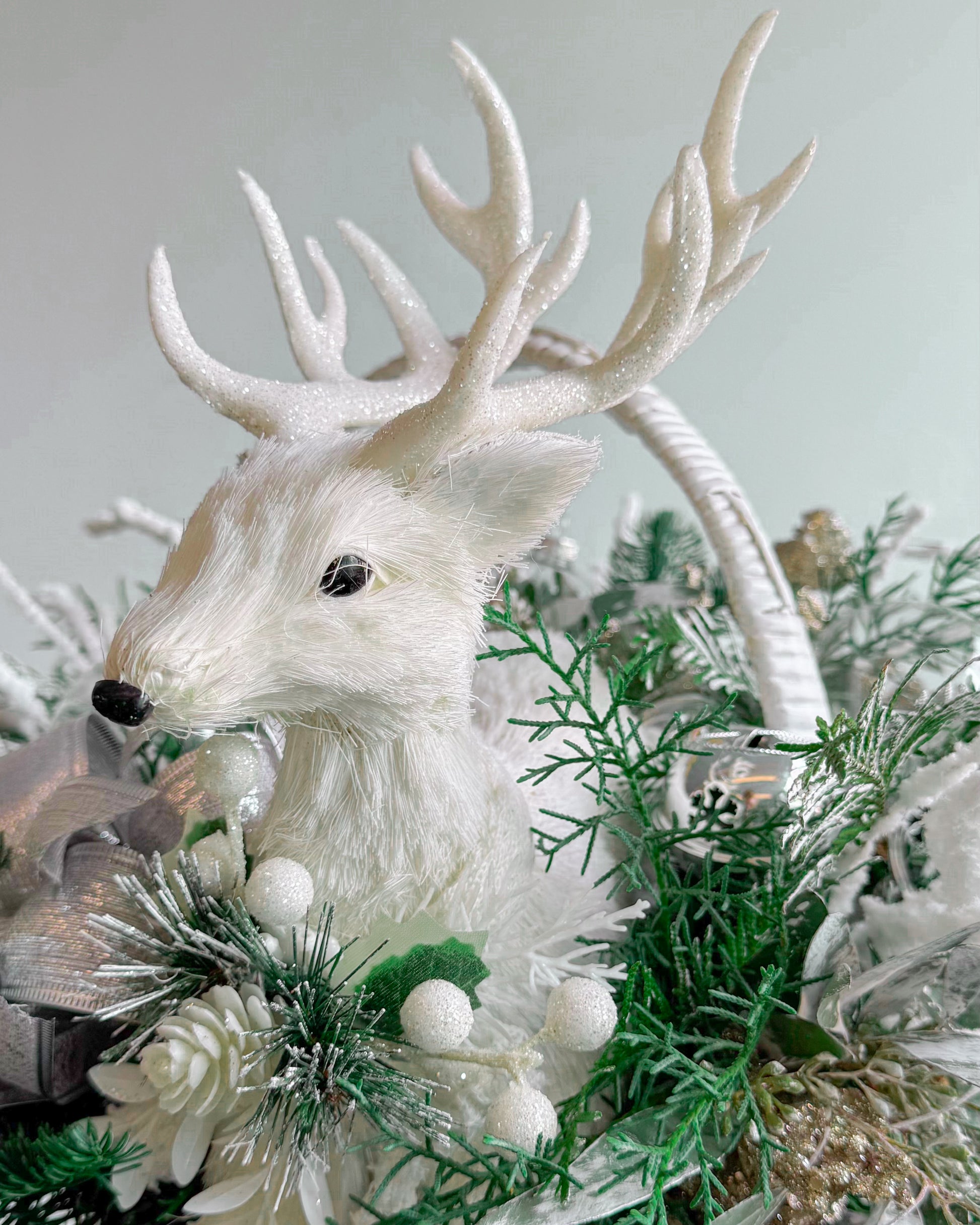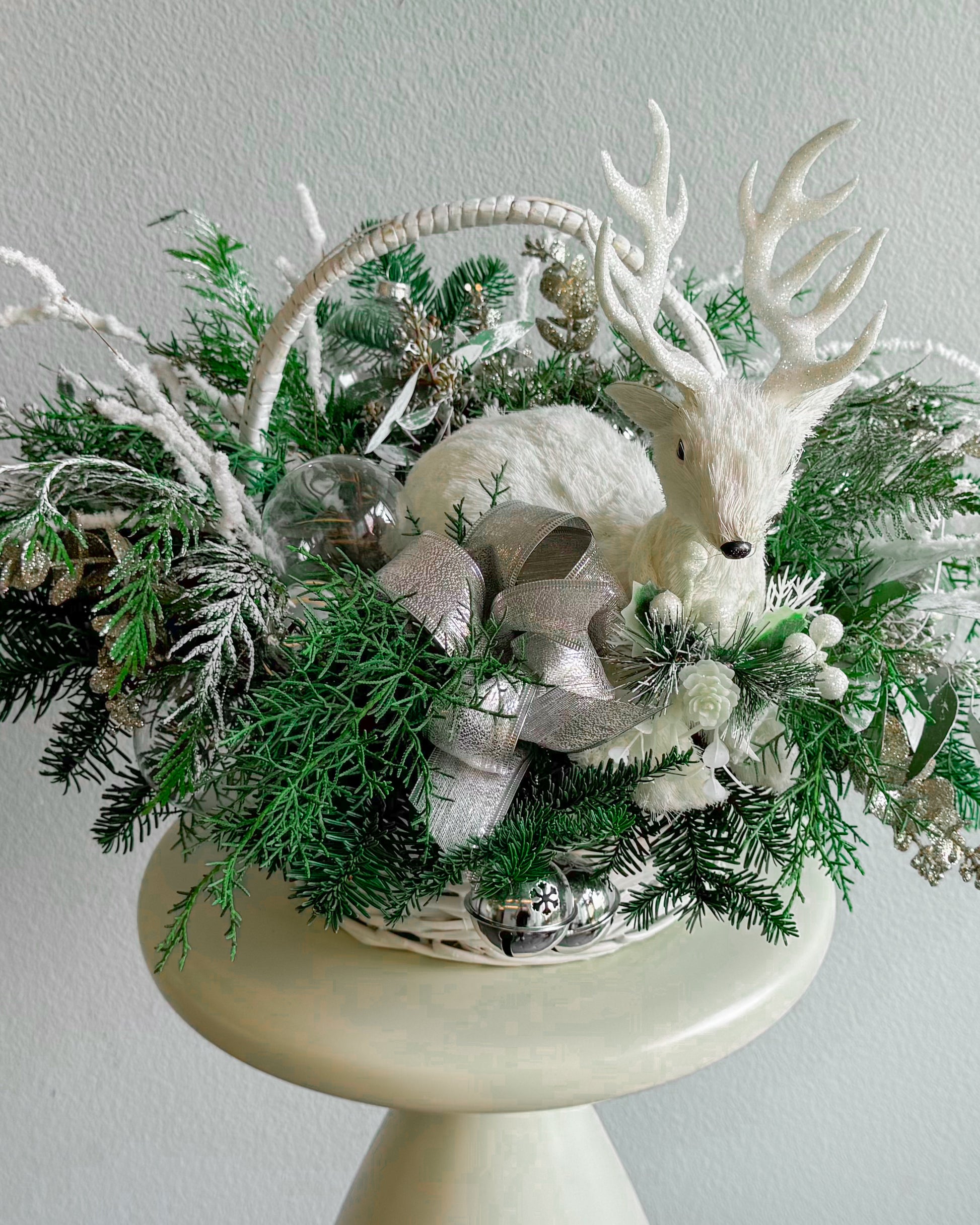 This Christmas bouquet feels like a magical forest captured in winter’s quiet beauty. It features a charming white reindeer nestled among snowy pine branches, frosted accents, and sparkling silver decorations. With its cozy and festive vibe, it’s the perfect centerpiece to bring warmth and joy to any holiday celebration.